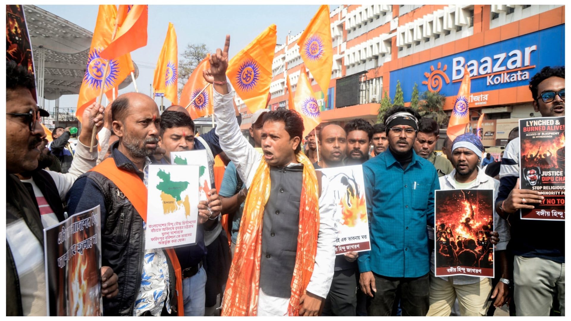 वहीं दूसरी ओर कोलकाता में बांग्लादेशी अल्पसंख्यकों पर हो रहे हमलों के विरोध में सैकड़ों लोगों ने मार्च निकाला। कोलकाता में ‘बोंगियो हिंदू जागरण’ के बैनर तले सैकड़ों प्रदर्शनकारियों ने ‘हिंदू हुंकार पदयात्रा’ निकाली। भगवा झंडे लिए प्रदर्शनकारी सियालदह से बांग्लादेश उप उच्चायोग की ओर बढ़ रहे थे, जिन्हें बेकबागान इलाके में भारी पुलिस बल ने रोक दिया।